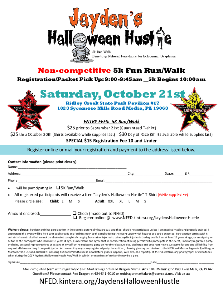 Noncompetitive 5k Fun Run/Walk Registration/Packet Pick Up: 9:009:45am __5k Begins 10:00amSaturday, October 21st Ridley Creek State Park Pavilion #17 1023 Sycamore Mills Road Media, PA 19063ENTRY