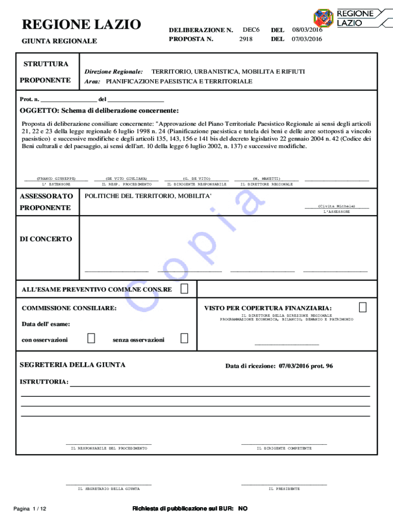 REGIONE LAZIODELIBERAZIONE N. DEC6 PROPOSTA N. 2918GIUNTA REGIONALEDEL DEL08/03/2016 07/03/2016STRUTTURA Direzione Regionale:PROPONENTETERRITORIO, URBANISTICA, MOBILITA E RIFIUTIArea: PIANIFICAZIONE