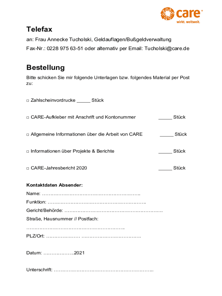 Telefax an: Frau Annecke Tucholski, Geldauflagen/Bugeldverwaltung FaxNr.: 0228 975 6351 oder alternativ per Email: Tucholski@care.deBestellung Bitte schicken Sie mir folgende Unterlagen bzw. folgendes