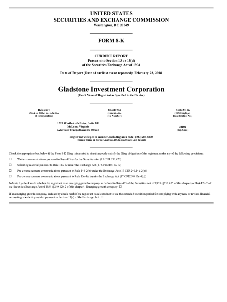 Get the free On February 22, 2018, Gladstone Investment Corporation (the Company), Gladstone Mana...