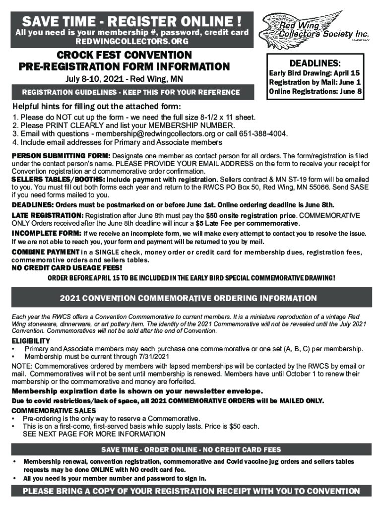 SAVE TIME REGISTER ONLINE !All you need is your membership #, password, credit card REDWINGCOLLECTORS.ORGCROCK FEST CONVENTION PREREGISTRATION FORM INFORMATION July 810, 2021 Red Wing, MNREGISTRATION