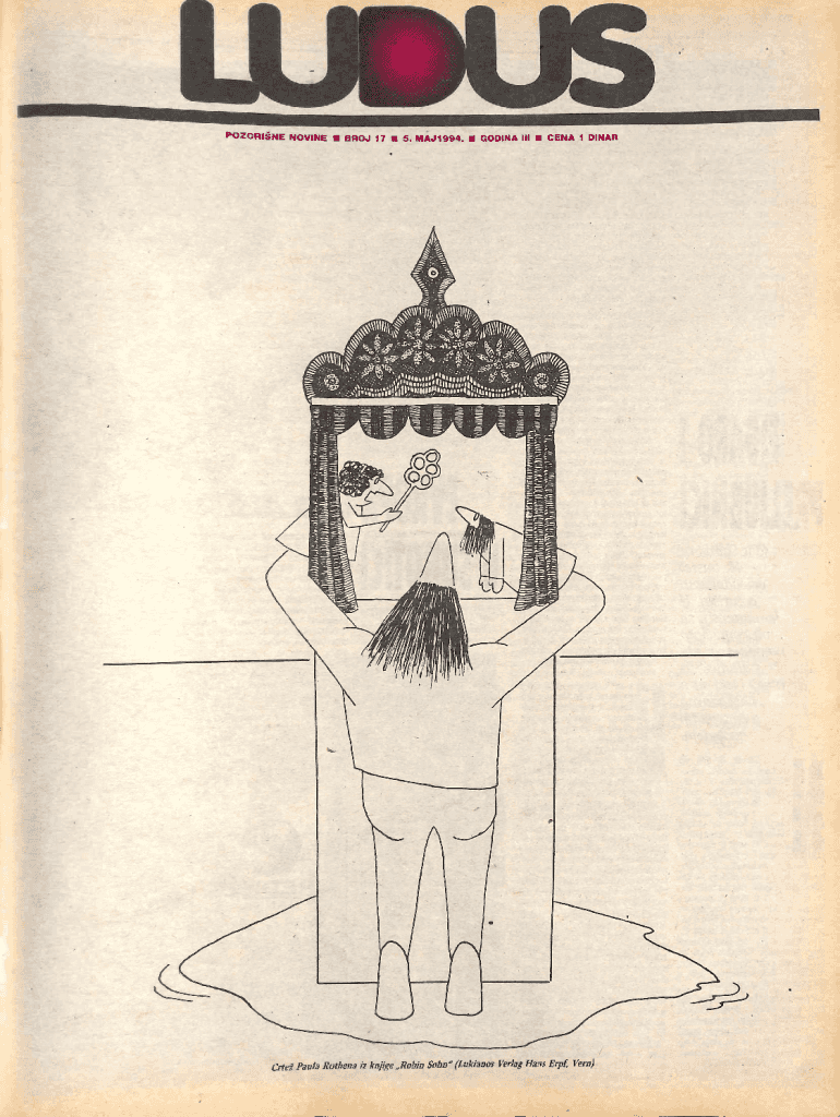 POZORINE NOVINE BROJ 17 15. MAJ1994. GODINA III CENA 1 DINARCrtez Paula Rothena iz knjige Robin Sohn\" (Lukianos Verlag Hans Erpf, Vem)vorim o odista uzbudljivo humornoj, upravo razdraganoj, smehotvorakoj