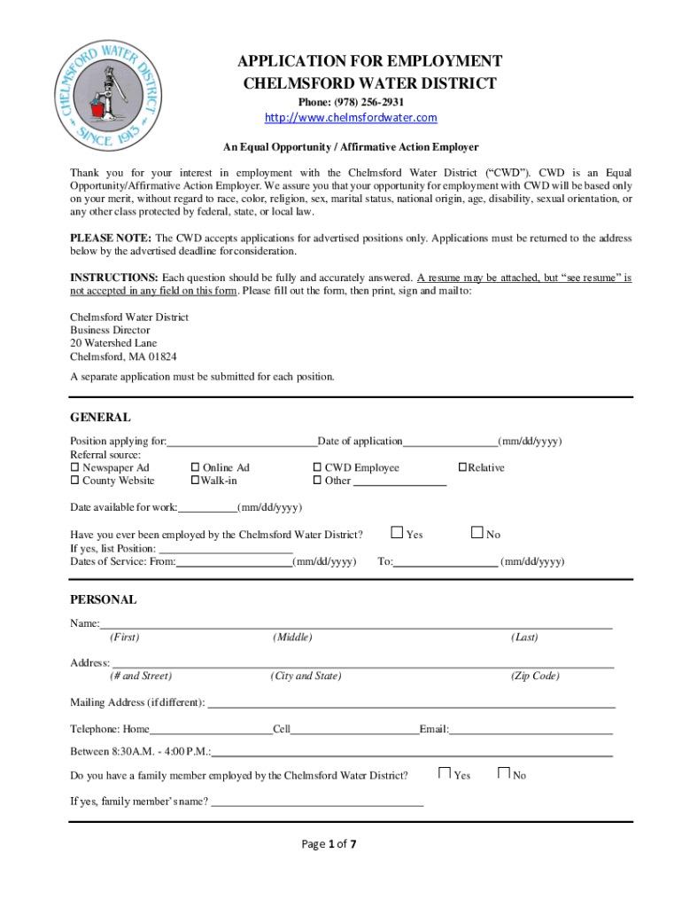 Get the free Application for EmploymentChelmsford Water District