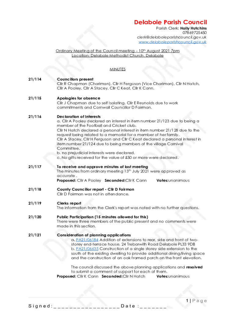 Delabole Parish Council Parish Clerk: Holly Hutchins 07869725450 clerk@delaboleparishcouncil.gov.uk www.delaboleparishcouncil.gov.uk Ordinary Meeting of the Council meeting 10th August 2021 7pm Location: