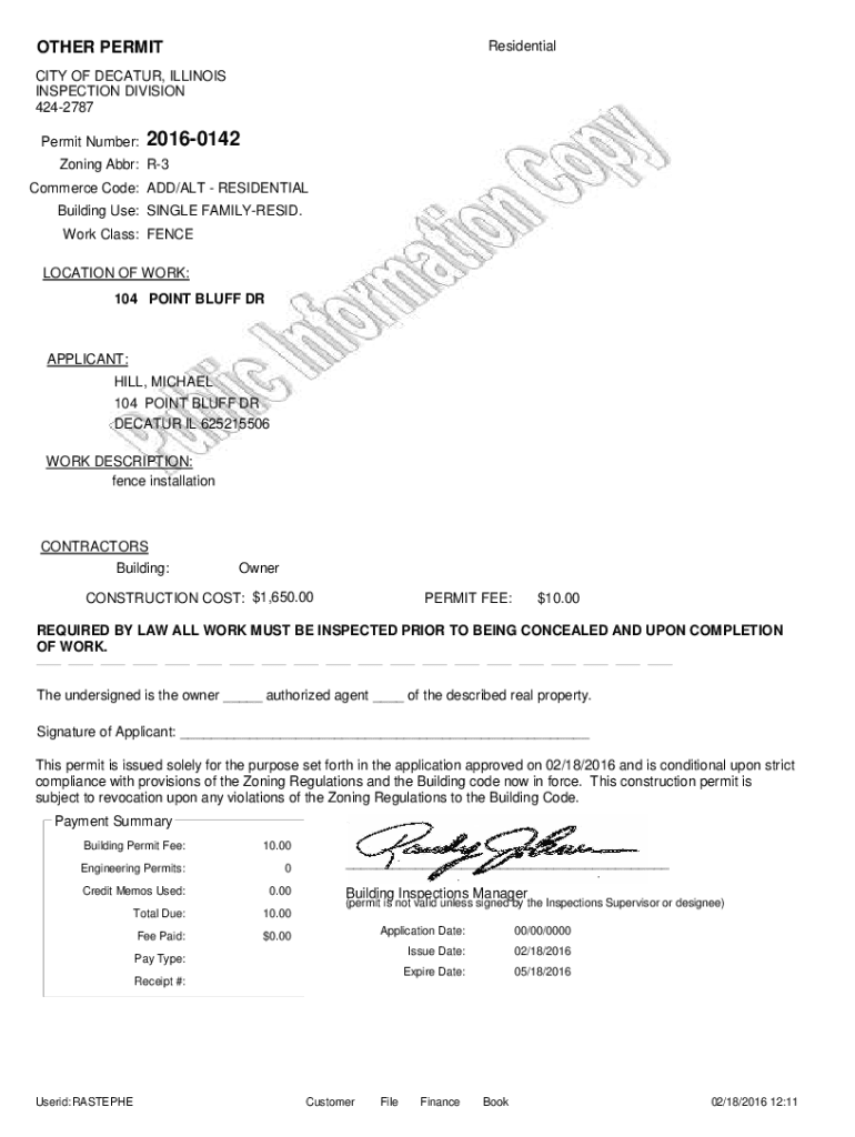 OTHER PERMITResidentialCITY OF DECATUR, ILLINOIS INSPECTION DIVISION 4242787 Permit Number:20160142Zoning Abbr: R3 Commerce Code: ADD/ALT RESIDENTIAL Building Use: SINGLE FAMILYRESID. Work Class: