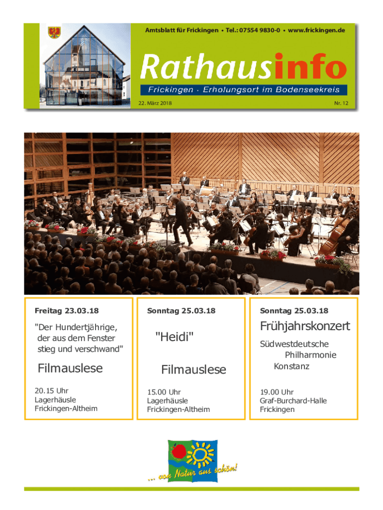 Amtsblatt fr Frickingen Tel.: 07554 98300 www.frickingen.de22. Mrz 2018Freitag 23.03.18\"Der Hundertjhrige, der aus dem Fenster stieg und verschwand\"Filmauslese 20.15 Uhr Lagerhusle FrickingenAltheimSonntag
