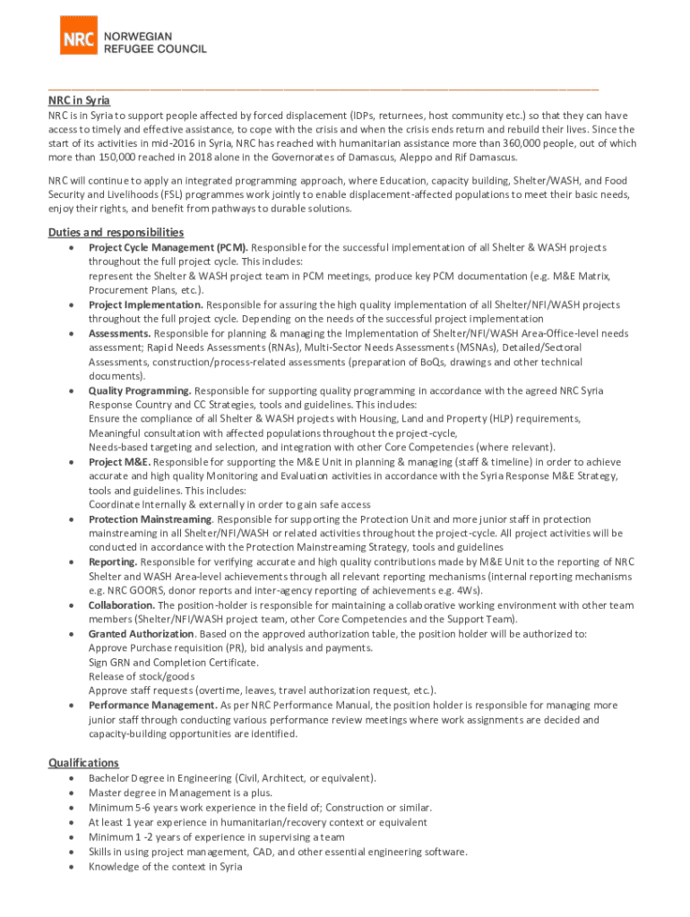 Get the free NRC in Syria Duties and responsibilities Qualifications