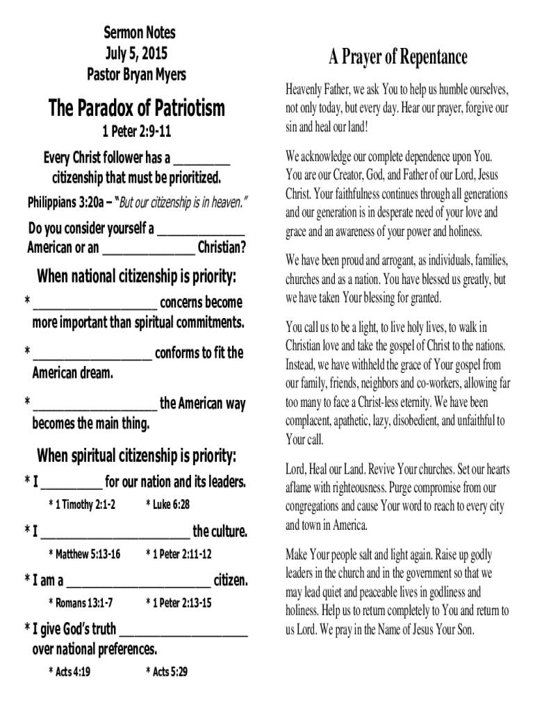 Sermon Notes July 5, 2015 Pastor Bryan MyersThe Paradox of Patriotism 1 Peter 2:911Every Christ follower has a ___ citizenship that must be prioritized. Philippians 3:20a But our citizenship is in