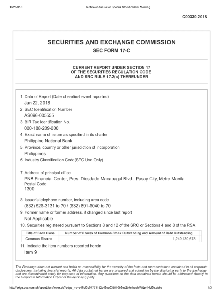 1/22/2018Notice of Annual or Special Stockholders\' MeetingC003302018SECURITIES AND EXCHANGE COMMISSION SEC FORM 17C CURRENT REPORT UNDER SECTION 17 OF THE SECURITIES REGULATION CODE AND SRC RULE