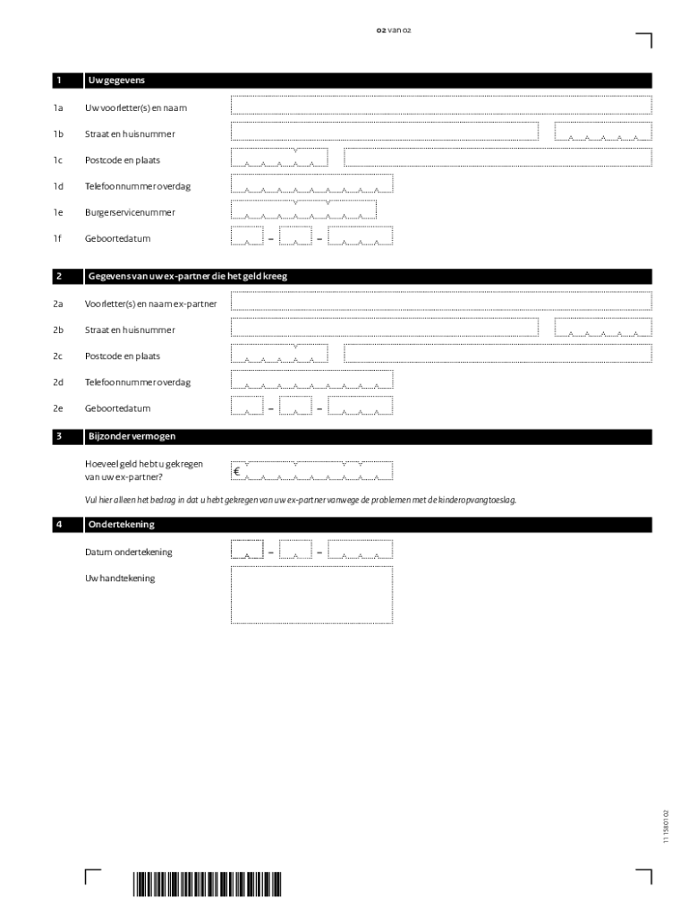 Taal: NederlandsVerzoekBijzonder vermogen toeslagen Voor expartners van ouders die gedupeerd zijn vanwege deproblemen met de kinderopvangtoeslagWaarom dit formulier? Heeft uw expartner geld van ons