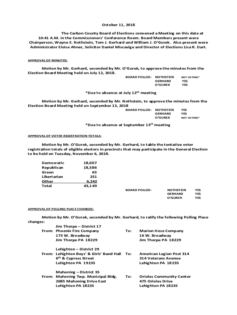 October 11, 2018 The Carbon County Board of Elections convened a Meeting on this date at 10:41 A.M. in the Commissioners Conference Room. Board Members present were Chairperson, Wayne E. Nothstein,