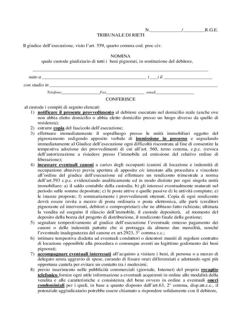 N.___/___R.G.E. TRIBUNALE DI RIETI Il giudice dellesecuzione, visto lart. 559, quarto comma cod. proc civ. NOMINA quale custode giudiziario di tutti i beni pignorati, in sostituzione del debitore,