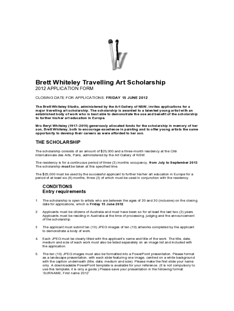 Brett Whiteley Travelling Art Scholarship 2012 APPLICATION FORM CLOSING DATE FOR APPLICATIONS: FRIDAY 15 JUNE 2012 The Brett Whiteley Studio, administered by the Art Gallery of NSW, invites applications