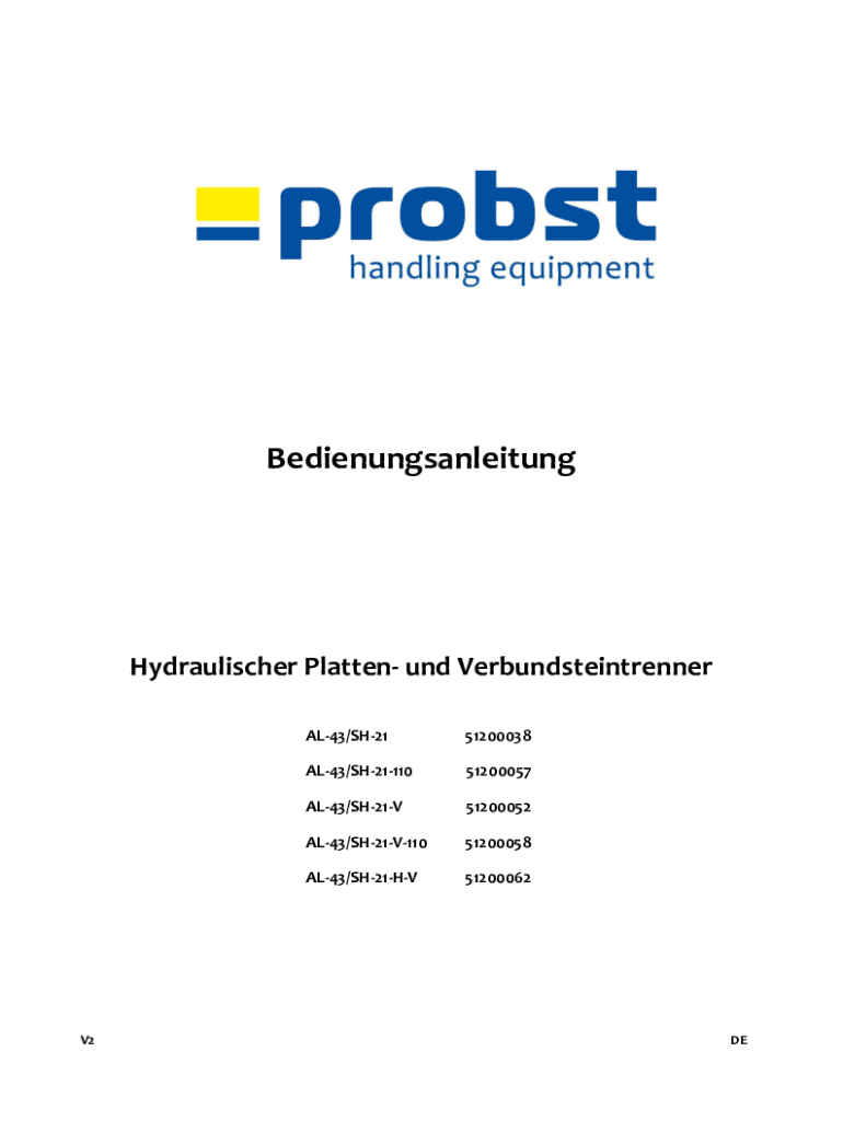 BedienungsanleitungHydraulischer Platten und VerbundsteintrennerV2AL43/SH2151200038AL43/SH2111051200057AL43/SH21V51200052AL43/SH21V11051200058AL43/SH21HV51200062DEInhalt2 / 22Inhalt 1.2.3.4.5.6.Vorwort
