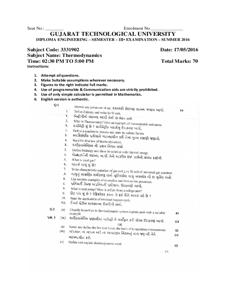 Seat No.: ___Enrolment No.___GUJARAT TECHNOLOGICAL UNIVERSITY DIPLOMA ENGINEERING SEMESTER III EXAMINATION SUMMER 2016Subject Code: 3331902 Subject Name: Thermodynamics Time: 02:30 PM TO 5:00 PM Instructions: