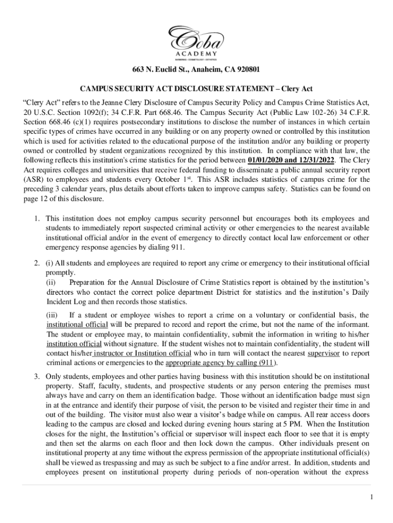 663 N. Euclid St., Anaheim, CA 920801 CAMPUS SECURITY ACT DISCLOSURE STATEMENT Clery Act Clery Act refers to the Jeanne Clery Disclosure of Campus Security Policy and Campus Crime Statistics Act,