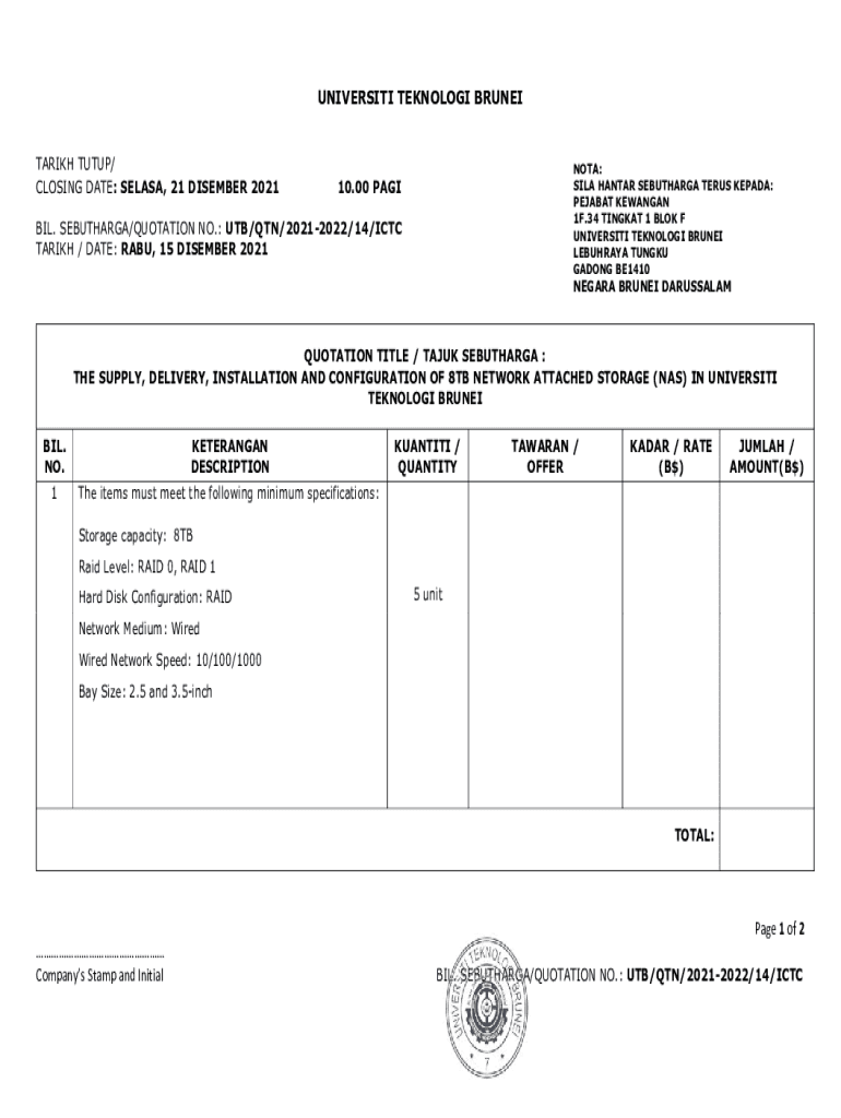 UNIVERSITI TEKNOLOGI BRUNEI TARIKH TUTUP/ CLOSING DATE: SELASA, 21 DISEMBER 2021NOTA: SILA HANTAR SEBUTHARGA TERUS KEPADA: PEJABAT KEWANGAN 1F.34 TINGKAT 1 BLOK F UNIVERSITI TEKNOLOGI BRUNEI LEBUHRAYA
