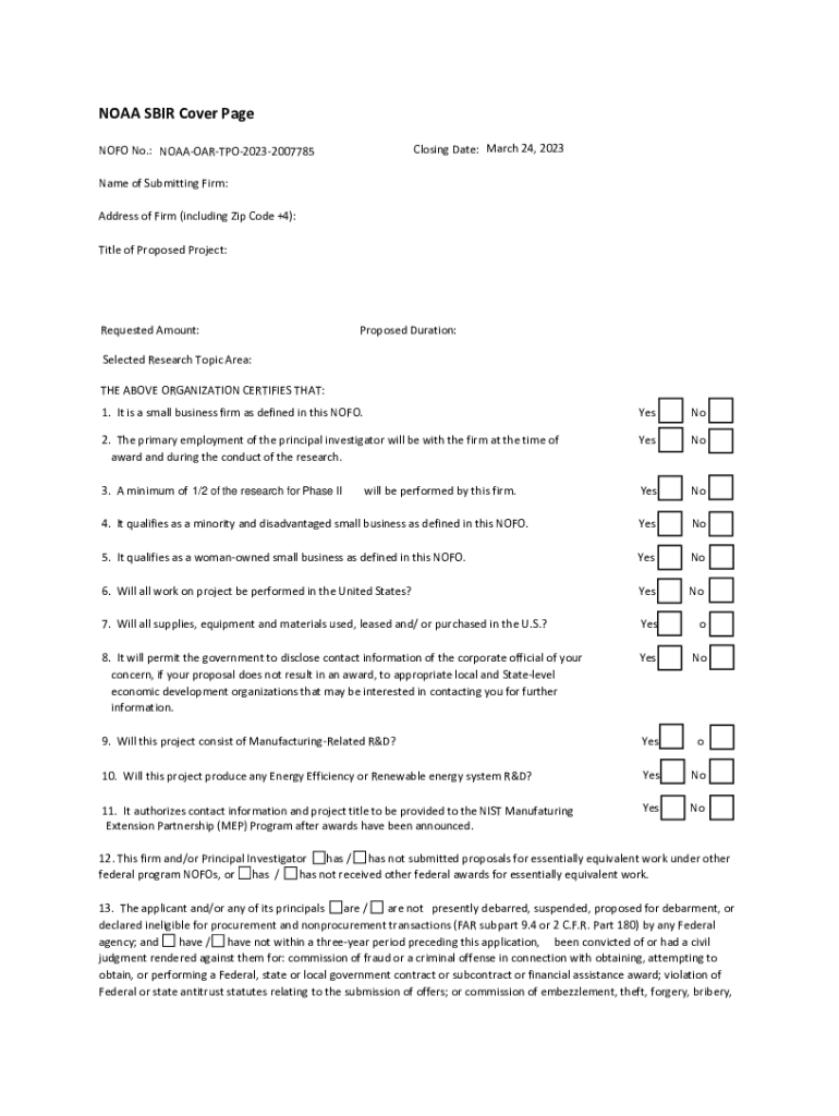 Small businesses and research institutions applying for funding through the NOAA SBIR program need to fill out the cover page as part of their application.