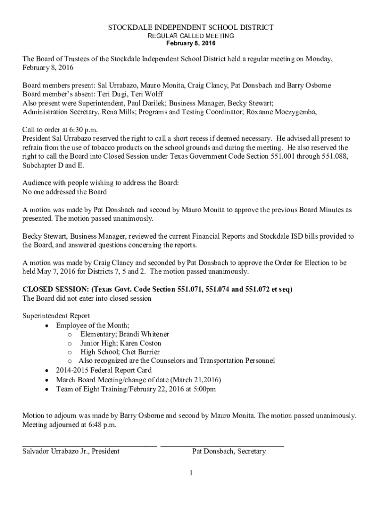 STOCKDALE INDEPENDENT SCHOOL DISTRICT REGULAR CALLED MEETING February 8, 2016The Board of Trustees of the Stockdale Independent School District held a regular meeting on Monday, February 8, 2016 Board