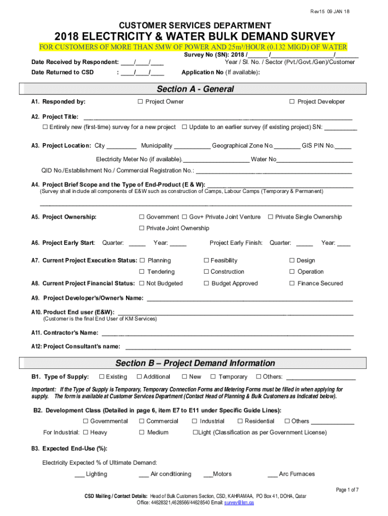 Rev15 09 JAN 18CUSTOMER SERVICES DEPARTMENT2018 ELECTRICITY & WATER BULK DEMAND SURVEY FOR CUSTOMERS OF MORE THAN 5MW OF POWER AND 25m/HOUR (0.132 MIGD) OF WATER Survey No (SN): 2018 /___ /___/___
