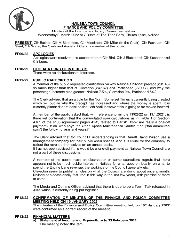 NAILSEA TOWN COUNCIL FINANCE AND POLICY COMMITTEE Minutes of the Finance and Policy Committee held on Wednesday 2 March 2022 at 7.30pm at The Tithe Barn, Church Lane, Nailsea. PRESENT: Cllr Barber,