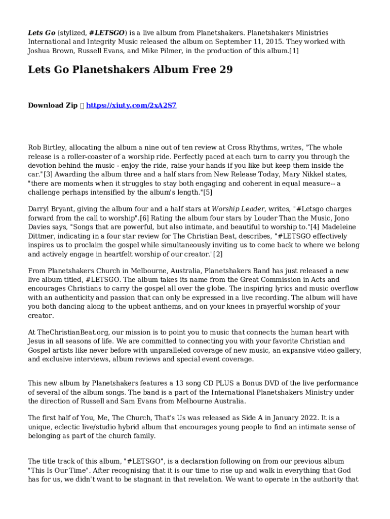 Let's Go (stylized, #LETS GO) is a live album from Planet shakers. Planet shakers Ministries International and Integrity Music released the album on September 11, 2015. They worked with Joshua Brown,