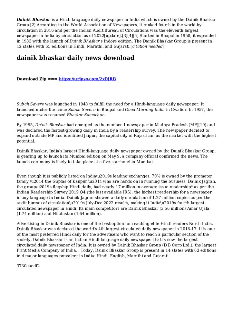Dainik Bhaskar is a Hindi language daily newspaper in India which is owned by the Dainik Bhaskar Group.[2] According to the World Association of Newspapers, it ranked fourth in the world by circulation