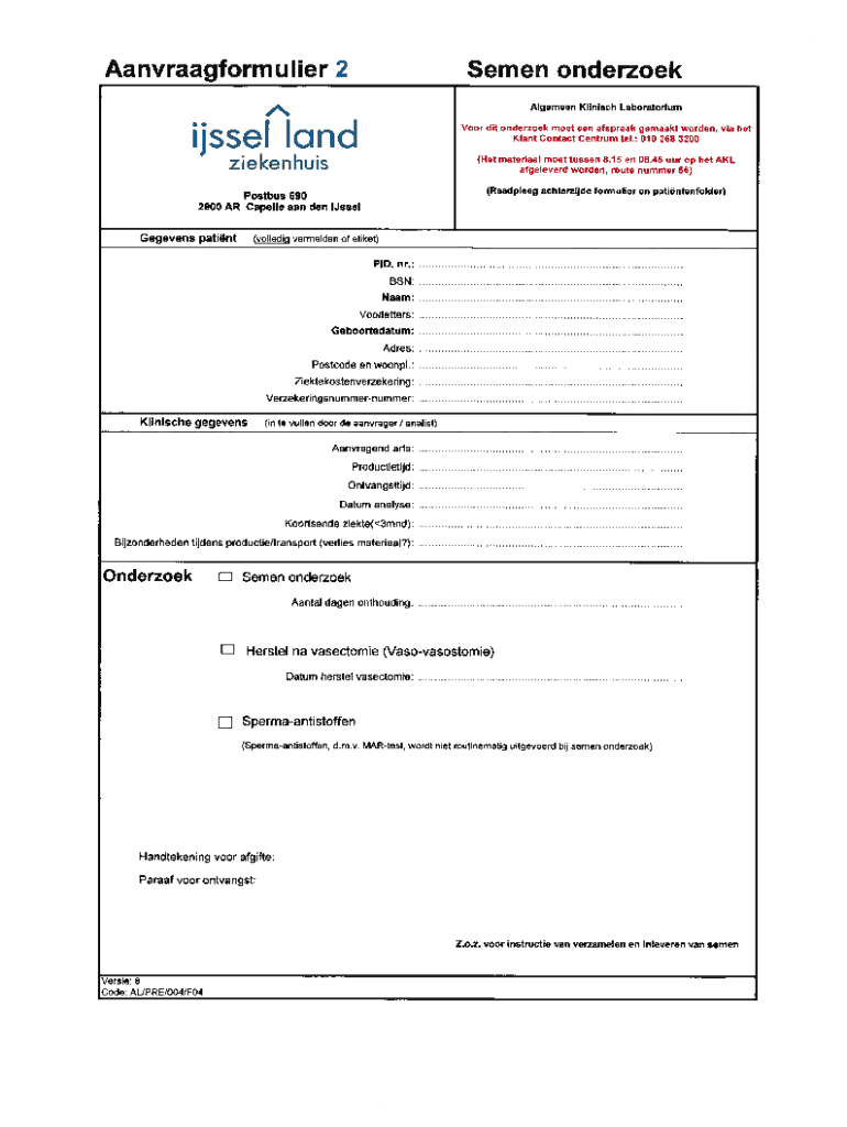 Aanvraagformulier 2Semen onderzoek Algemeen Klinisch Laboratorum, c riij sseVoor dit onderzoek moet een afspraak gemaakt worden, via het Kiant Contact Centrum tel.: 010 258 3200 (Hetmateriaal moettussen