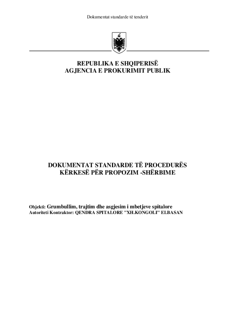 Dokumentat standarde t tenderitREPUBLIKA E SHQIPERIS AGJENCIA E PROKURIMIT PUBLIKDOKUMENTAT STANDARDE T PROCEDURS KRKES PR PROPOZIM SHRBIMEObjekti: Grumbullim, trajtim dhe asgjesim i mbetjeve spitalore