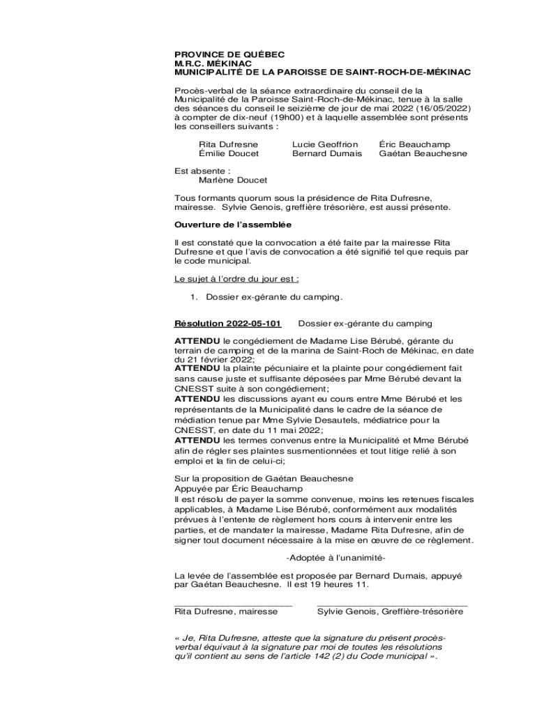 PROVINCE DE QUBEC M.R.C. MKINAC MUNICIPALIT DE LA PAROISSE DE SAINTROCHDEMKINAC Procsverbal de la sance extraordinaire du conseil de la Municipalit de la Paroisse SaintRochdeMkinac, tenue la salle
