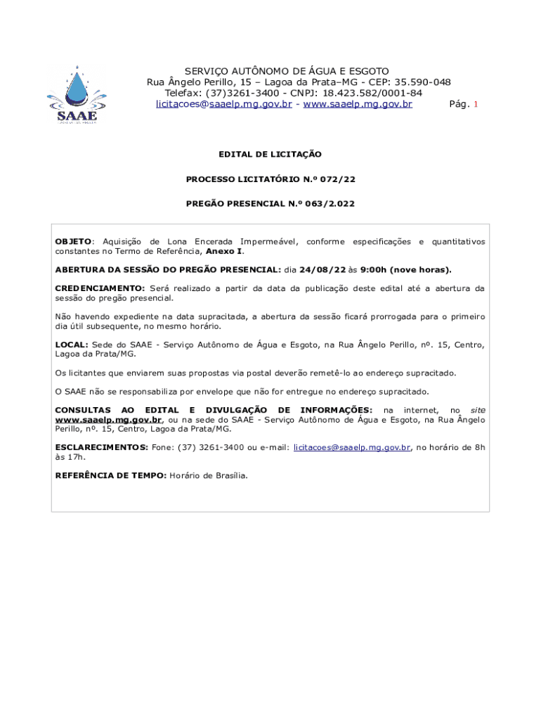 SERVIO AUTNOMO DE GUA E ESGOTO Rua ngelo Perillo, 15 Lagoa da PrataMG CEP: 35.590048 Telefax: (37)32613400 CNPJ: 18.423.582/000184 licitacoes@saaelp.mg.gov.br www.saaelp.mg.gov.br Pg. 1EDITAL DE LICITAO