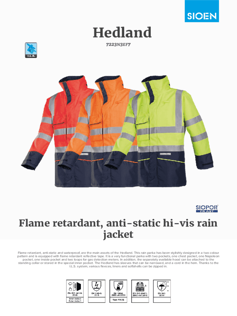 Hedland 7223N3EF7Flame retardant, antistatic hivis rain jacket Flame retardant, antistatic and waterproof, are the main assets of the Hedland. Thisrain parka has been stylishly designed in a two colour