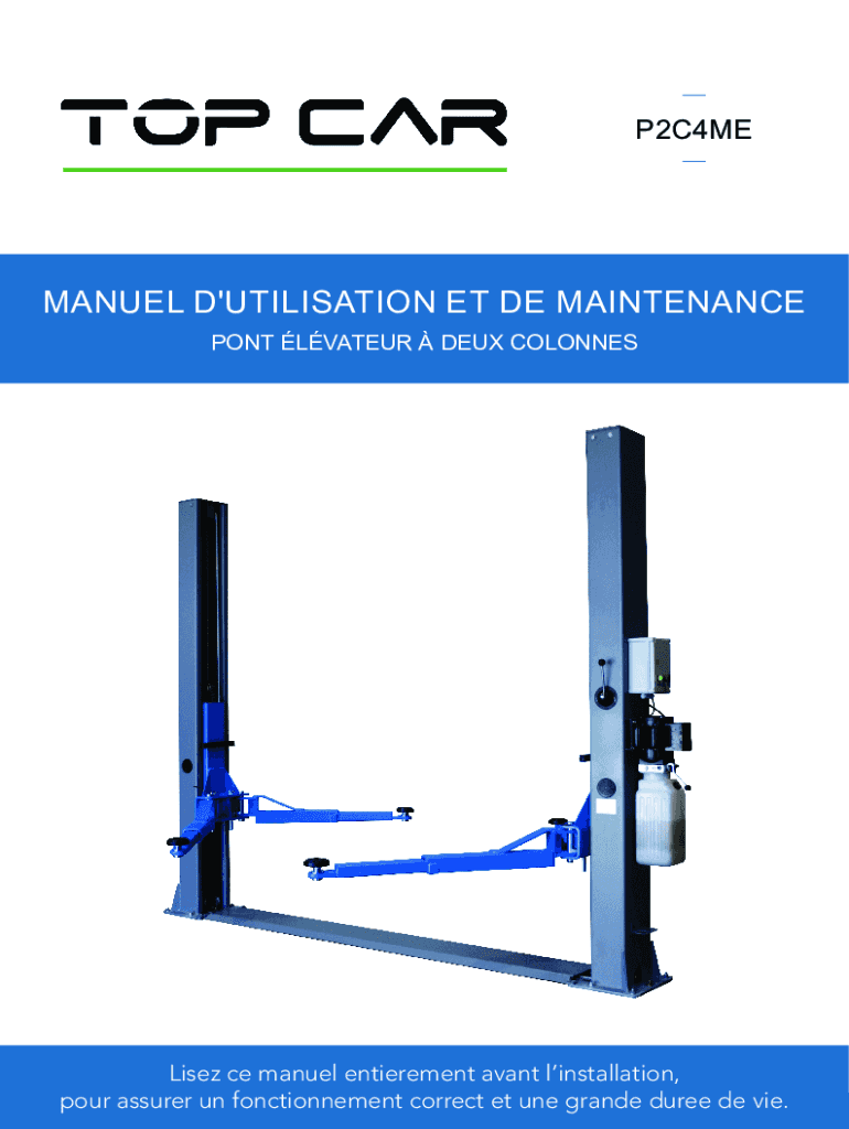 P2C4MEMANUEL D\'UTILISATION ET DE MAINTENANCE PONT LVATEUR DEUX COLONNESLisez ce manuel entierement avant linstallation, pour assurer un fonctionnement 1correct et une grande duree de vie. / 43TABLE
