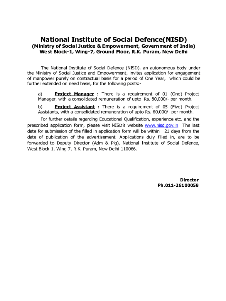 National Institute of Social Defence(NISD)(Ministry of Social Justice & Empowerment, Government of India) West Block1, Wing7, Ground Floor, R.K. Puram, New Delhi The National Institute of Social Defence