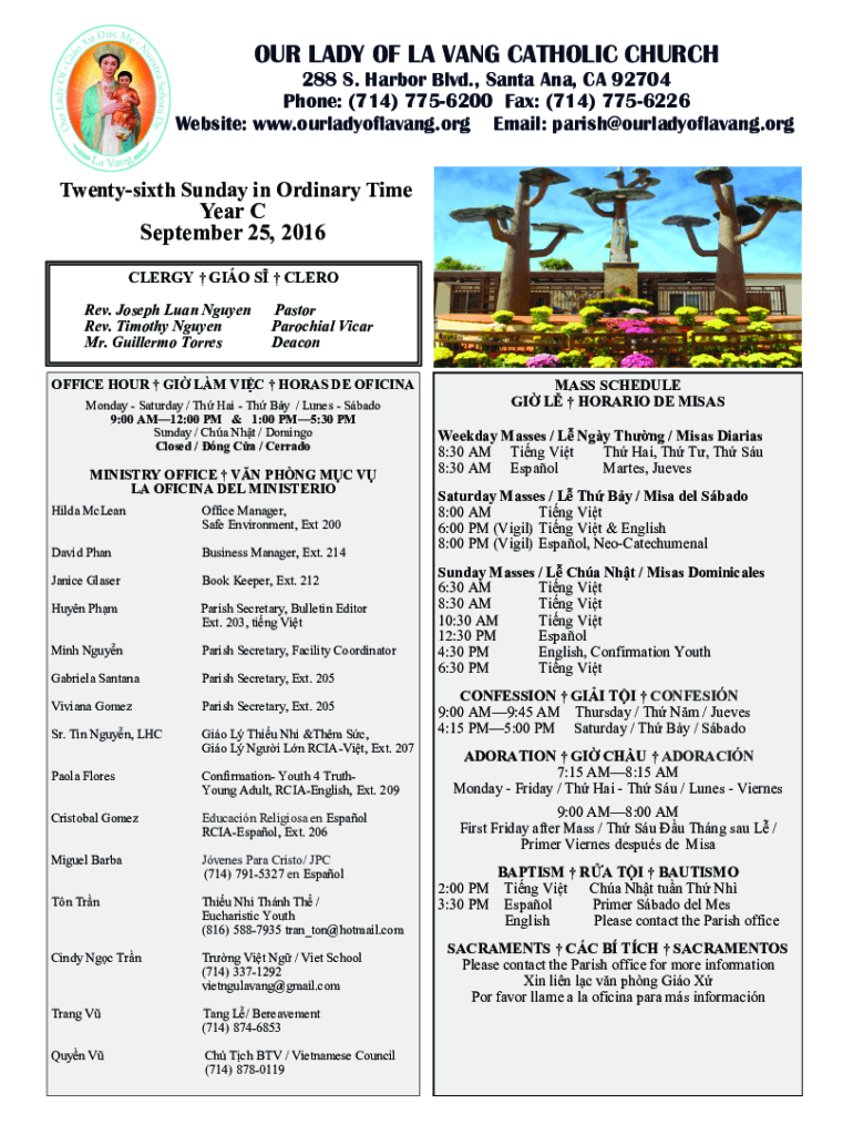 OUR LADY OF LA VANG CATHOLIC CHURCH 288 S. Harbor Blvd., Santa Ana, CA 92704 Phone: (714) 7756200 Fax: (714) 7756226 Website: www.ourladyoflavang.org Email: parish@ourladyoflavang.orgTwentysixth Sunday