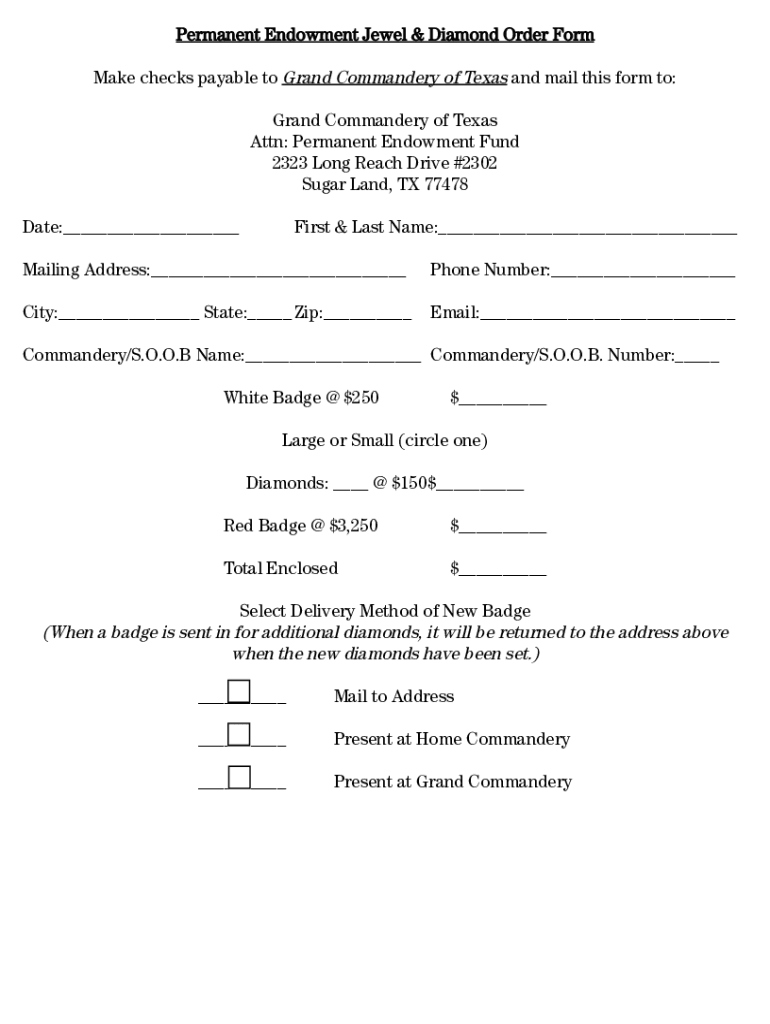 Grand Commandery of Texas Permanent Endowment Fund 2323 Long Reach Drive #2302 Sugar Land, TX 77478 The Permanent Endowment Fund was created to provide a longterm resource that supports the goals