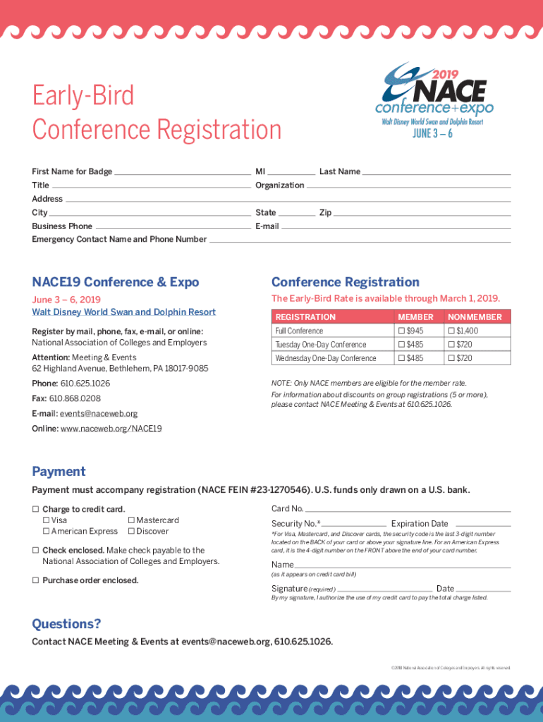 EarlyBird Conference Registration First Name for BadgeMILast NameTitleOrganization Address CityStateZip Business PhoneEmail Emergency Contact Name and Phone NumberNACE19 Conference & ExpoConference