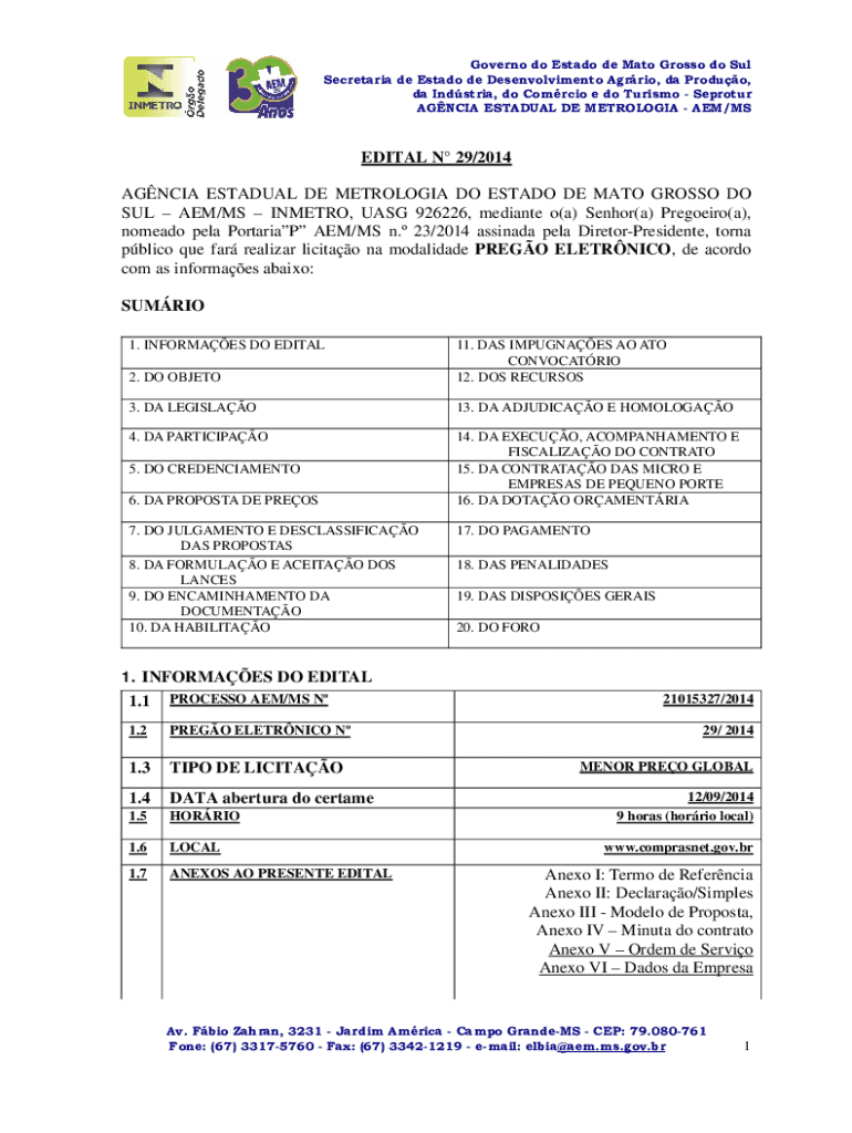 Obtenha o gratuito SUL AEM/MS INMETRO, UASG 926226, mediante o(a) Senhor(a) Pregoeiro(a),