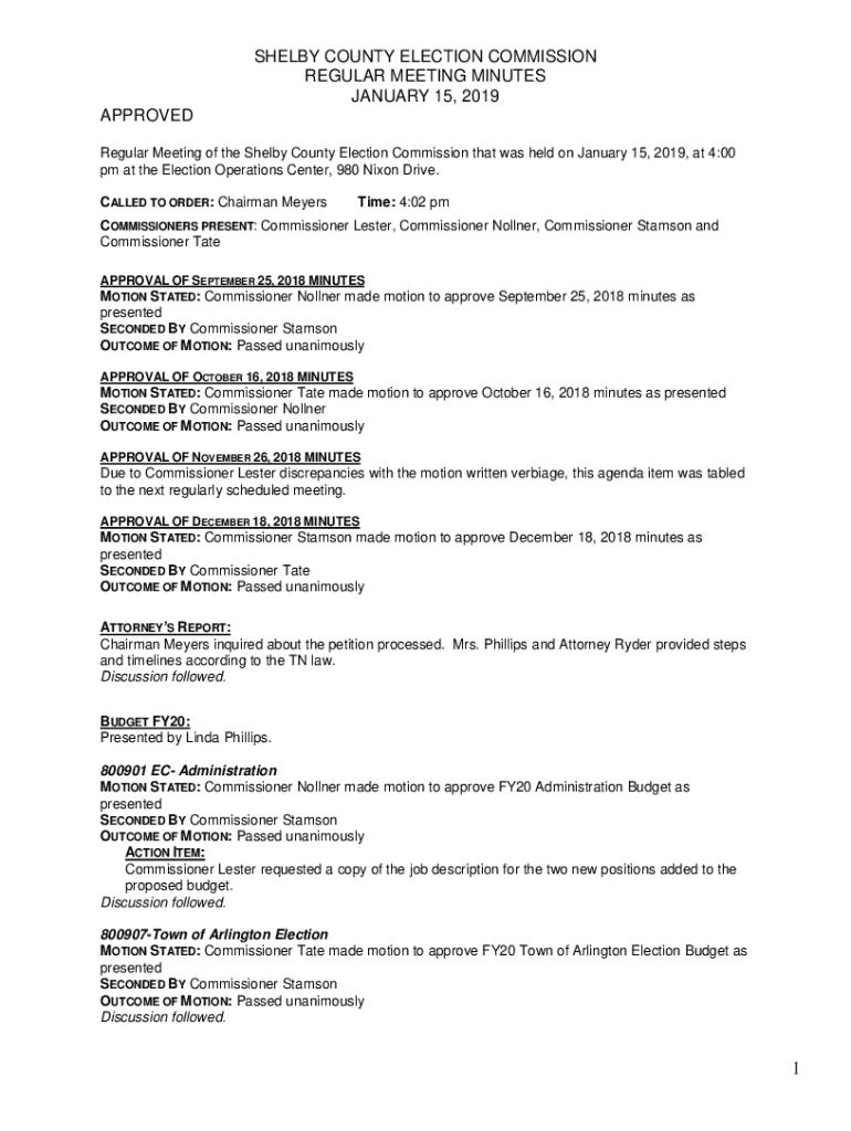 SHELBY COUNTY ELECTION COMMISSION REGULAR MEETING MINUTES JANUARY 15, 2019 APPROVED Regular Meeting of the Shelby County Election Commission that was held on January 15, 2019, at 4:00 pm at the Election