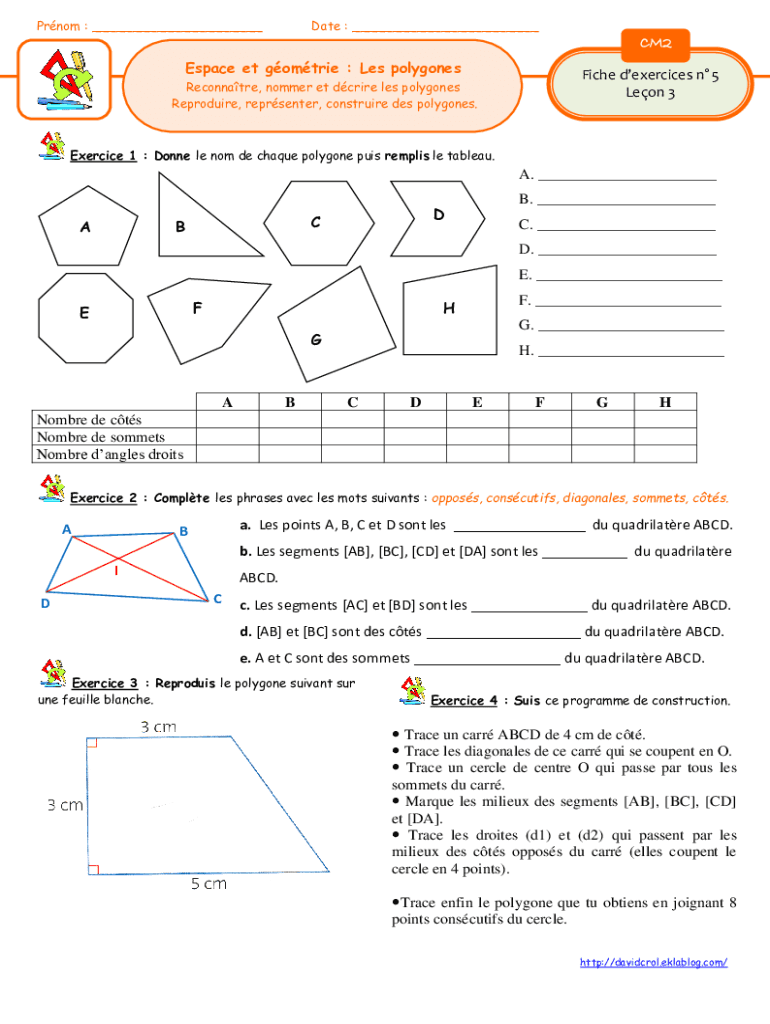 Prnom : ___Date : ___CM2 Espace et gomtrie : Les polygonesFiche dexercices n 5 Leon 3Reconnatre, nommer et dcrire les polygones Reproduire, reprsenter, construire des polygones.Exercice 1 : Donne