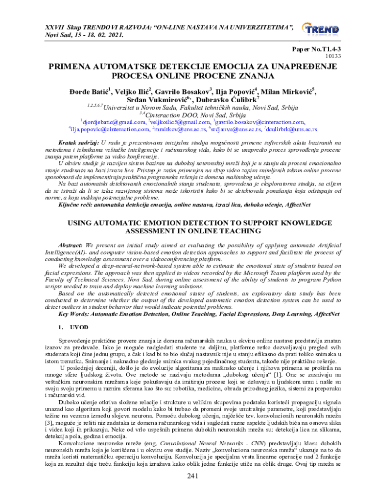 XXVII Skup TRENDOVI RAZVOJA: ONLINE NASTAVA NA UNIVERZITETIMA, Novi Sad, 15 18. 02. 2021. Paper No.T1.43 10133PRIMENA AUTOMATSKE DETEKCIJE EMOCIJA ZA UNAPREENJE PROCESA ONLINE PROCENE ZNANJA ore Bati1,
