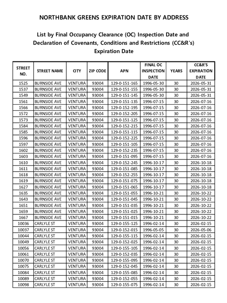 NORTHBANK GREENS EXPIRATION DATE BY ADDRESS List by Final Occupancy Clearance (OC) Inspection Date and Declaration of Covenants, Conditions and Restrictions (CC&R\'s) Expiration Date STREET NO. 1525