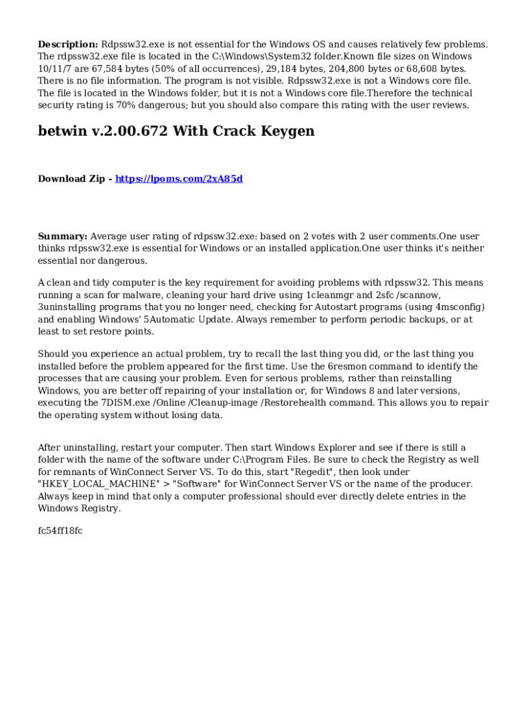 Description: Rdpssw32.exe is not essential for the Windows OS and causes relatively few problems. The rdpssw32.exe file is located in the C:WindowsSystem32 folder.Known file sizes on Windows 10/11/7