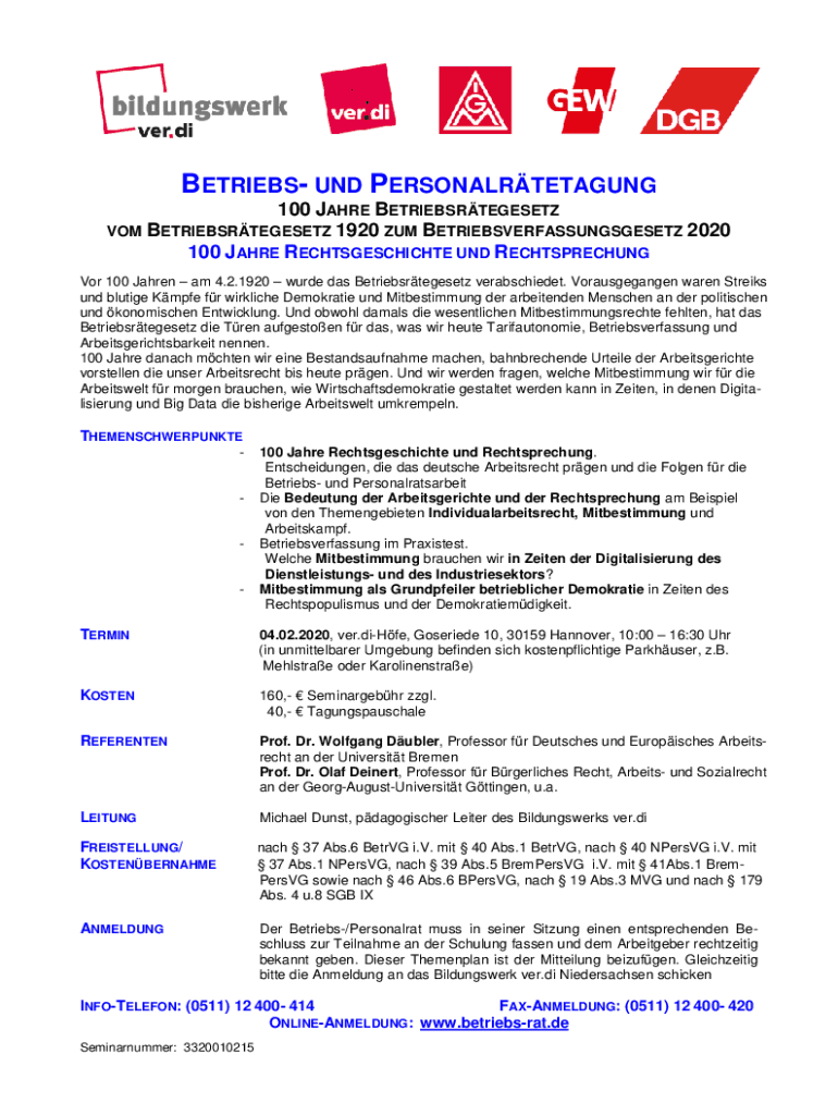 BETRIEBS UND PERSONALRTETAGUNG 100 JAHRE BETRIEBSRTEGESETZ VOM BETRIEBSRTEGESETZ 1920 ZUM BETRIEBSVERFASSUNGSGESETZ 2020 100 JAHRE RECHTSGESCHICHTE UND RECHTSPRECHUNG Vor 100 Jahren am 4.2.1920 wurde