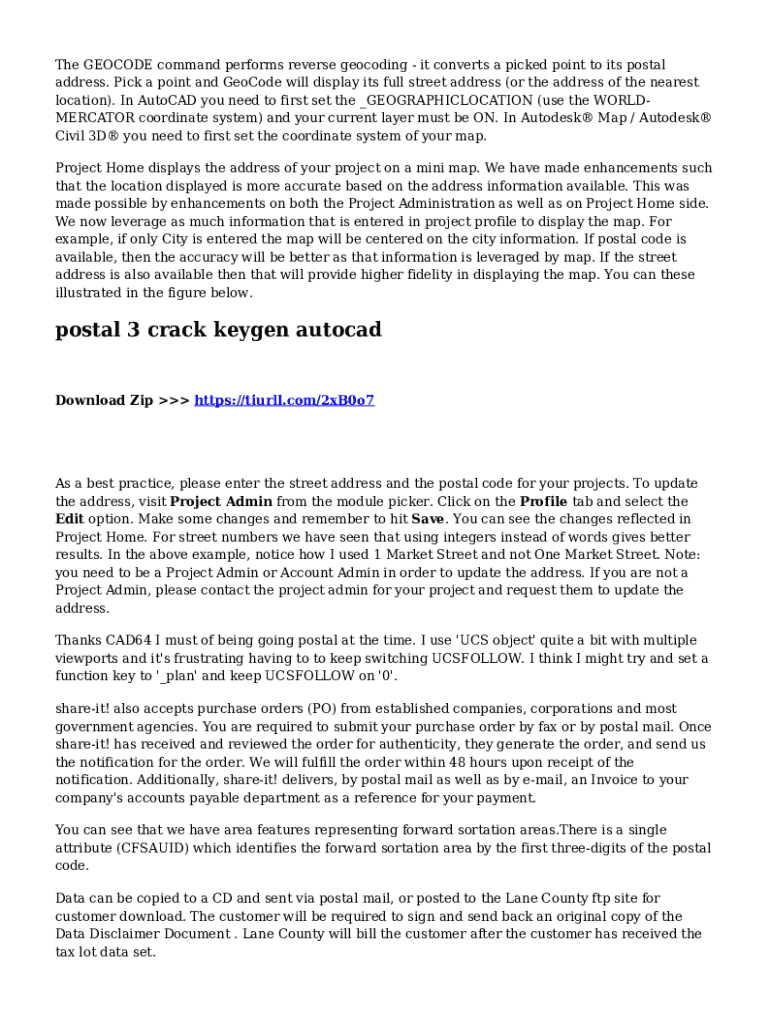 The GEOCODE command performs reverse geocoding it converts a picked point to its postal address. Pick a point and GeoCode will display its full street address (or the address of the nearest location).
