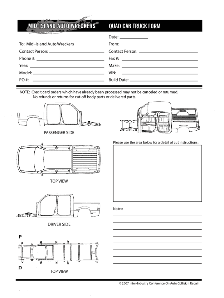 QUAD CAB TRUCK FORM Date: To: Mid Island Auto WreckersFrom:Contact Person:Contact Person:Phone #:Fax #:Year:Make:Model:VIN:PO #:Build Date:NOTE: Credit card orders which have already been processed