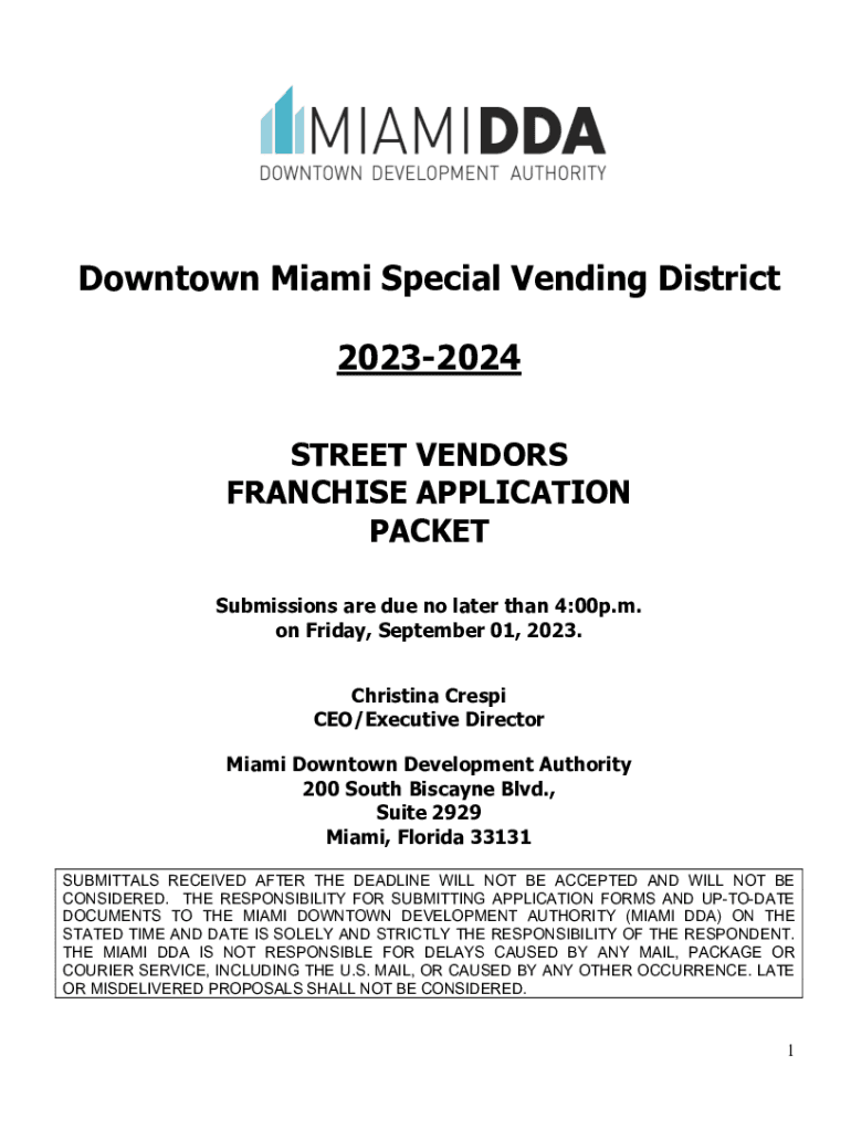 Downtown Miami Special Vending District 20232024 STREET VENDORS FRANCHISE APPLICATION PACKET Submissions are due no later than 4:00p.m. on Friday, September 01, 2023. Christina Crespi CEO/Executive