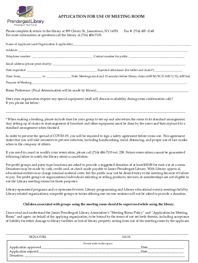 APPLICATION FOR USE OF MEETING ROOMPlease complete & return to the library at 509 Cherry St., Jamestown, NY 14701