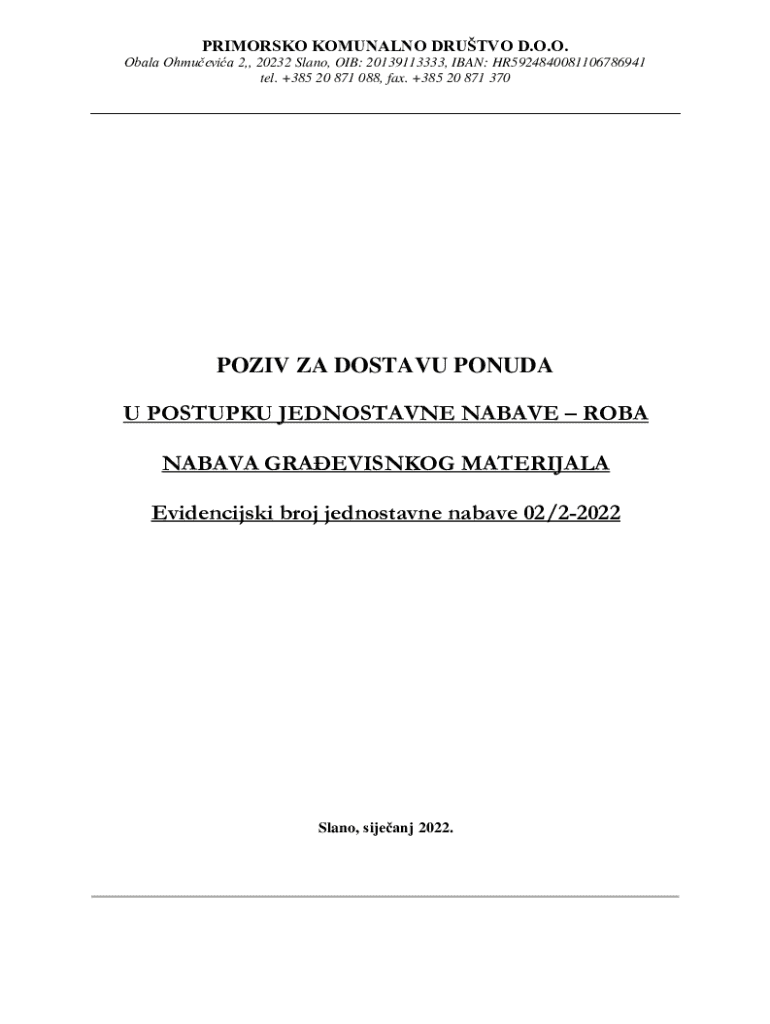 PRIMORSKO KOMUNALNO DRUTVO D.O.O. Obala Ohmuevia 2,, 20232 Slano, OIB: 20139113333, IBAN: HR5924840081106786941 tel. +385 20 871 088, fax. +385 20 871 370POZIV ZA DOSTAVU PONUDA U POSTUPKU JEDNOSTAVNE