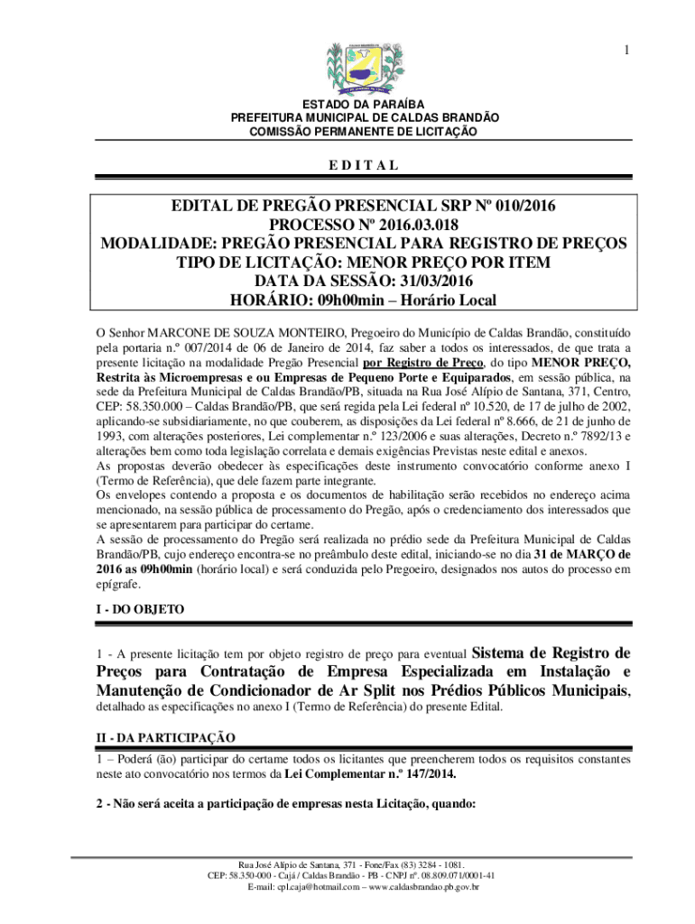 1ESTADO DA PARABA PREFEITURA MUNICIPAL DE CALDAS BRANDO COMISSO PERMANENTE DE LICITAOEDITALEDITAL DE PREGO PRESENCIAL SRP N 010/2016 PROCESSO N 2016.03.018 MODALIDADE: PREGO PRESENCIAL PARA REGISTRO